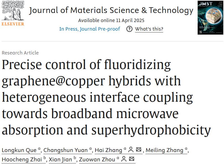 博士生阙龙坤在周祚万教授指导下,提出一种基于石墨烯氟化异质界面精准调控策略,同时实现杂化纳米材料高效宽频吸波和超疏水功能。作者在前期提出的前驱体原位分解制备石墨烯包覆通纳米颗粒(GE@Cu,Carbon, 2024, 225: 119121)基础上,通过精确控制石墨烯氟化,调控F-GE@Cu异质界面的功能耦合,实现了纳米材料的宽带微波吸收和超疏水性能。实验和理论研究结果表明,氟化反应显著提升了了材料的阻抗匹配和电磁波损耗;同时,氟化石墨烯壳层结构赋予材料优异的超疏水性(纳米材料水接触角达154°),即使在酸性、碱性和盐溶液等恶劣的水环境中,该杂化纳米材料也能保持稳定结构稳定性和良好电磁波吸收性能。基于电磁参数模拟计算结果显示,3.5mm厚度下氟化纳米材料的反射率衰减可达-53.0dB,有效吸收带宽8.9GHz。相关研究以“Precise control of fluoridizing graphene@copper hybrids with heterogeneous interface coupling towards broadband microwave absorption and superhydrophobicity”为题发表于近期出版的材料科学顶级期刊(中科院一区TOP,中国科技期刊卓越行动计划英文领军期刊)Journal of Materials Science & Technology,2025,238:13-23 (doi.org/10.1016/j.jmst.2025.02.054). 看看屋