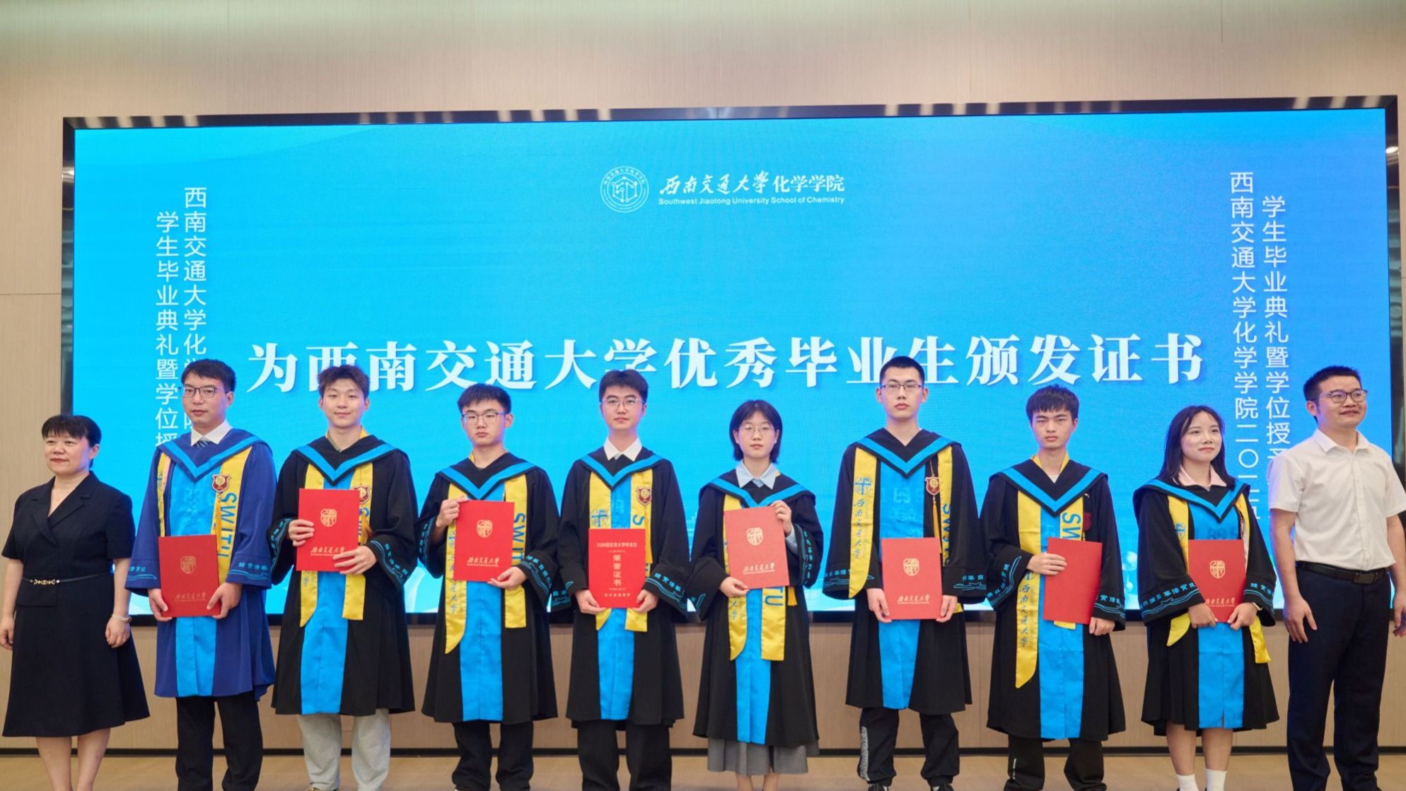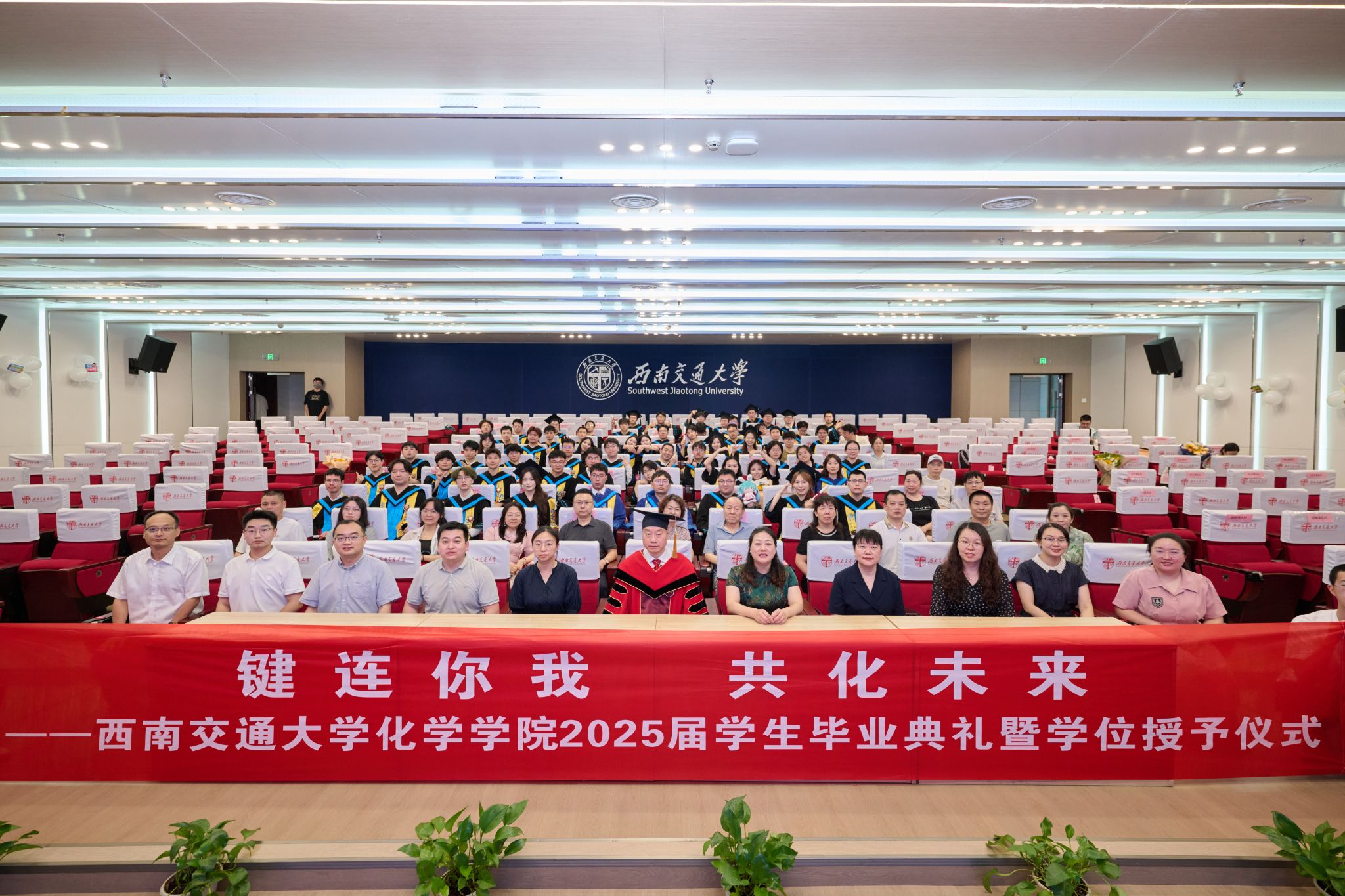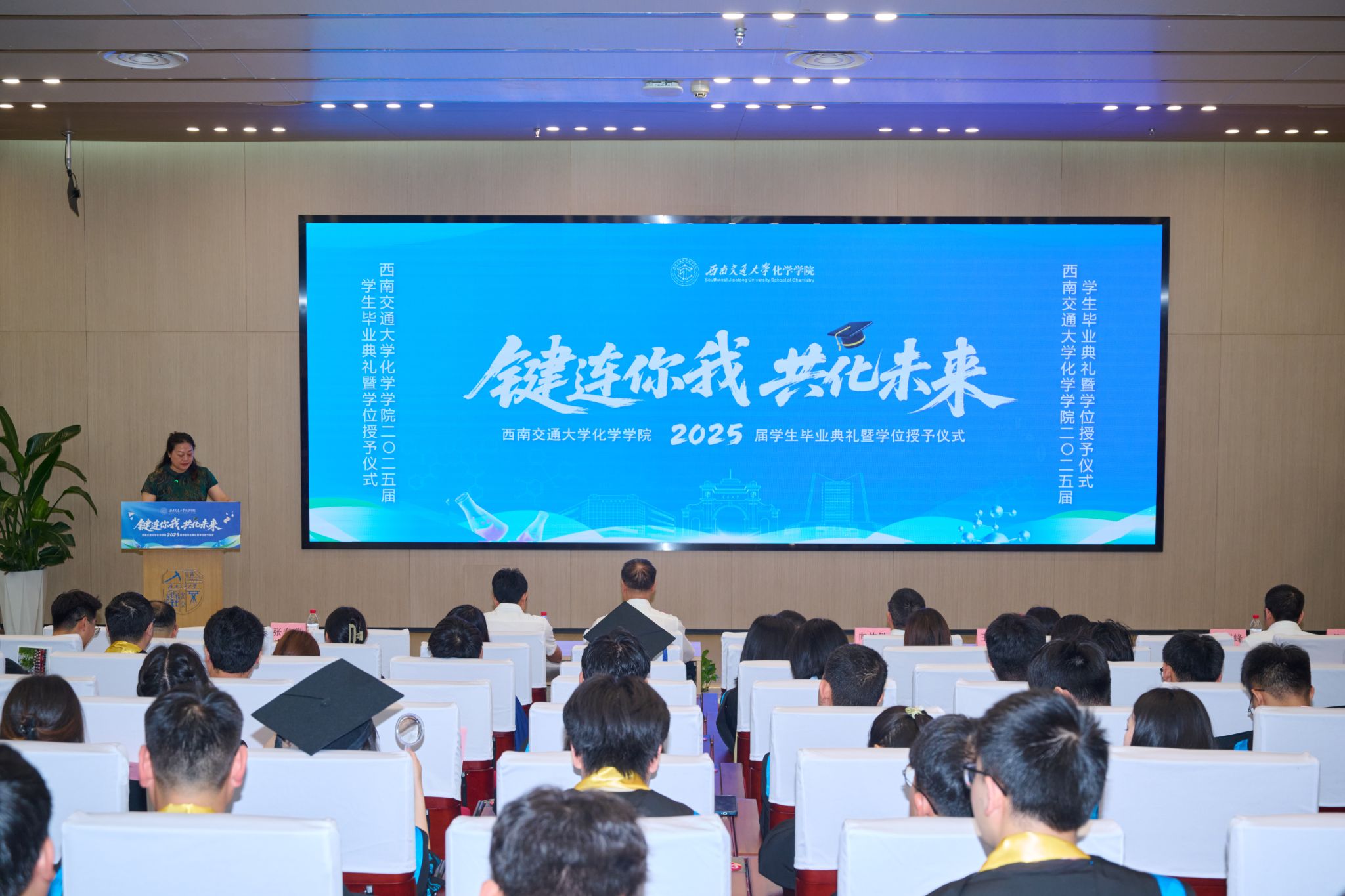 6月20日下午,看看屋 2025届学生毕业典礼暨学位授予仪式在犀浦校区二号报告厅隆重举行。看看屋 党委书记向仲敏,院长周祚万,党委副书记张春燕,副院长王雅雯,校友代表、电子科技大学材料与能源学院教授简贤,院务委员郑剑峰,教学督导组组长、退休教师管棣,高分子系主任杨静晖、副主任高霞,合成化学系主任彭羽,应用化学系主任王萃娟,公共化学教学部主任张颜,本科2021级学生班导师,专业课教师,学生工作组全体辅导员,全体本科毕业生、研究生毕业生代表及学生家长出席典礼。典礼由张春燕副书记主持。
