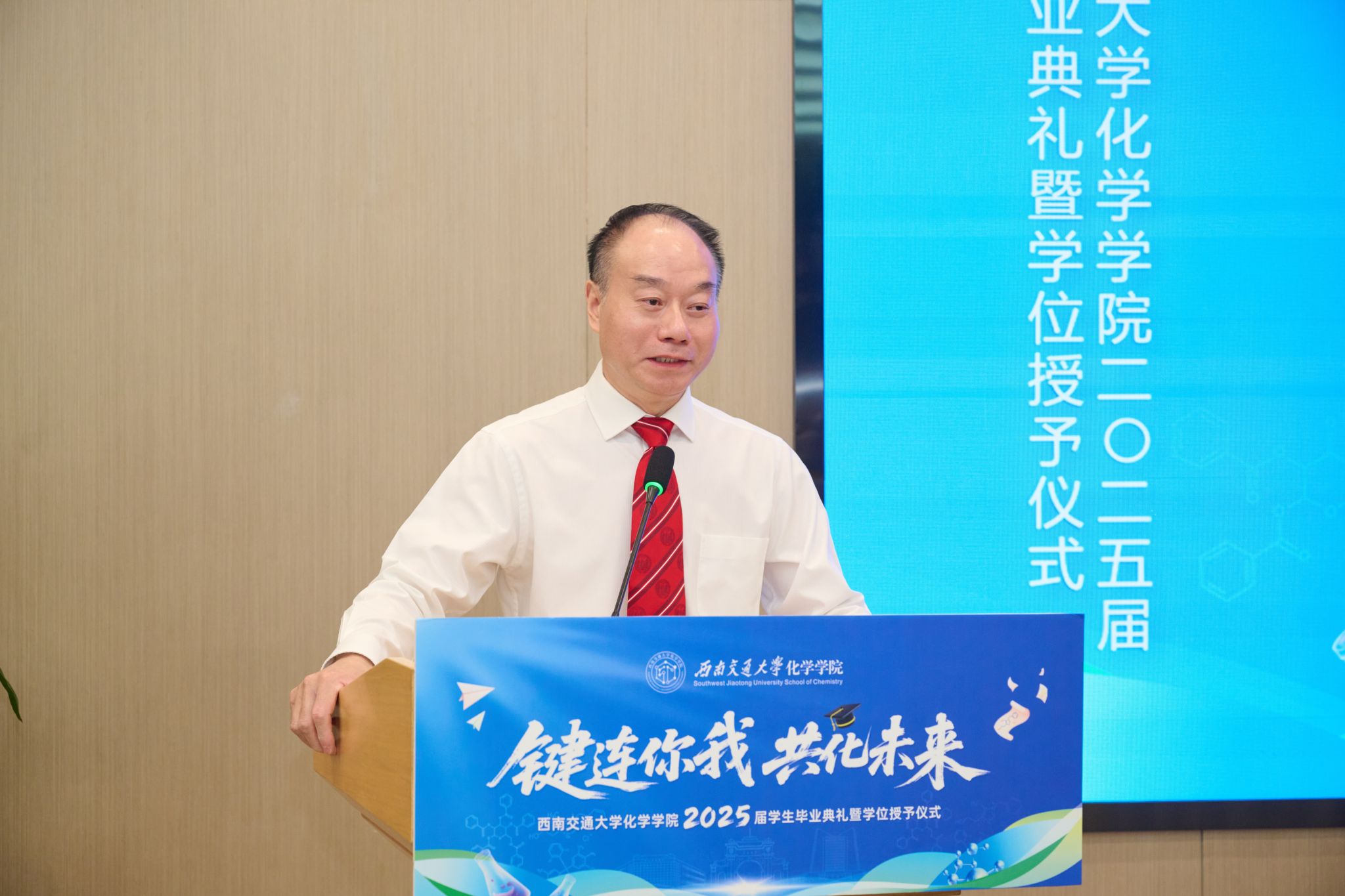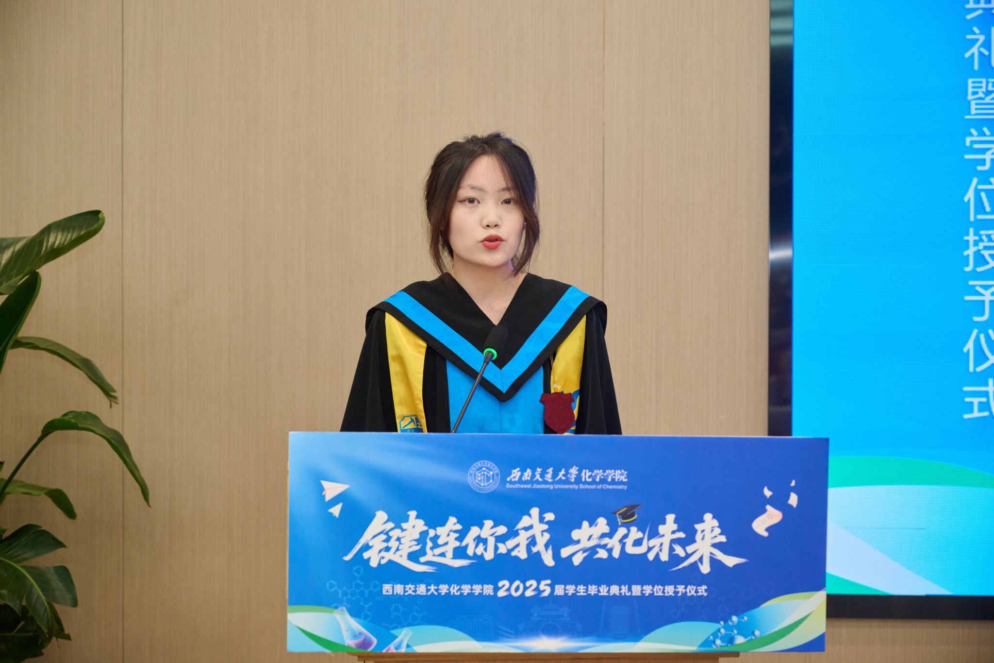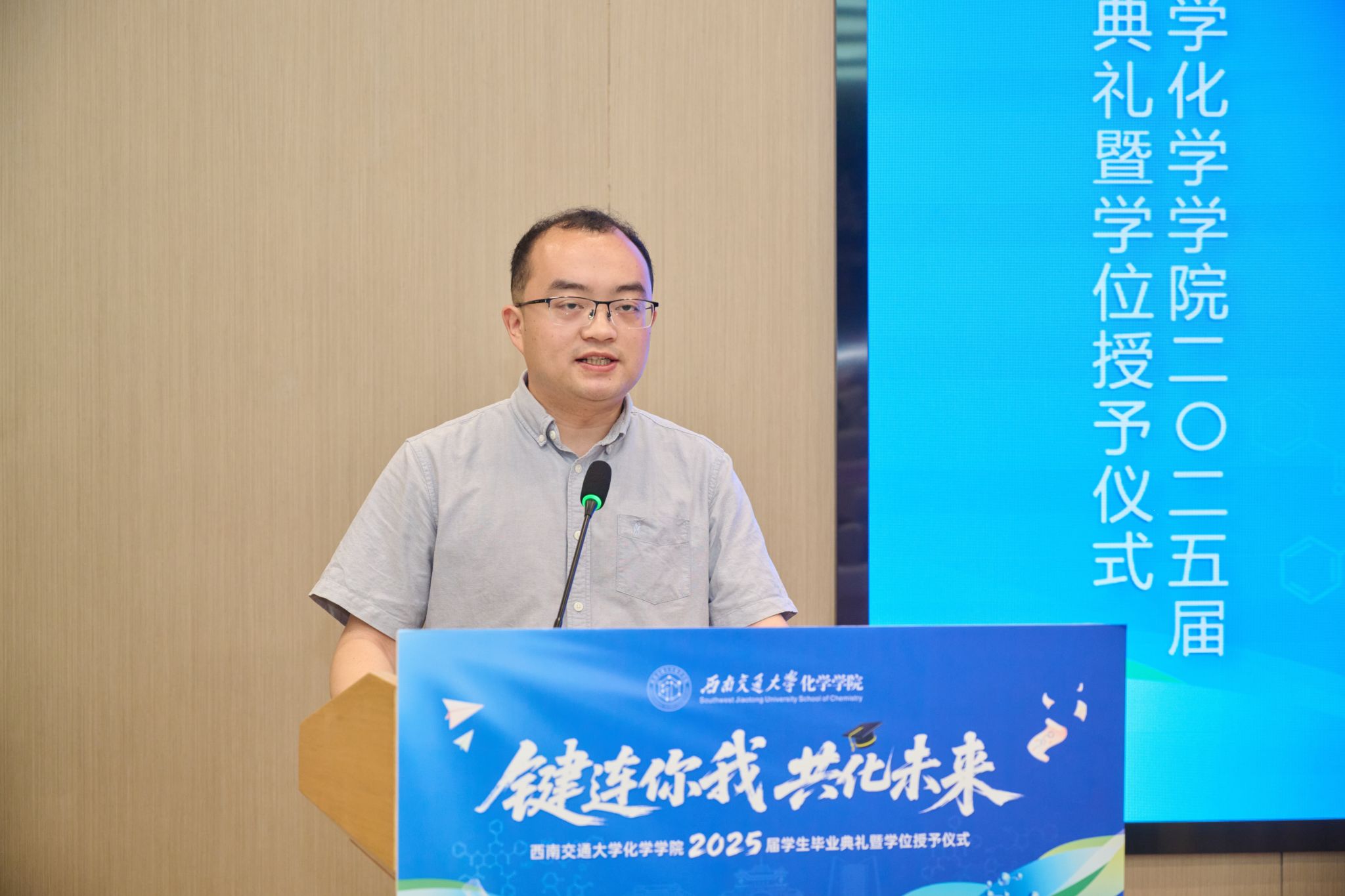 此次典礼还特别邀请了校友代表、电子科技大学材料与能源学院教授、博士生导师简贤发言。简贤校友于2003年至2013年(本硕博)就读于高分子材料与工程方向,他分享了自己的求学经历和职业发展历程,鼓励毕业生们要珍惜时光,不断进取,为国家和社会的繁荣发展贡献自己的力量。他的发言赢得了现场师生的热烈掌声。