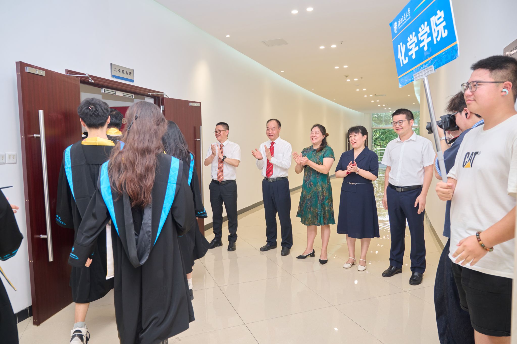 典礼开始前,学院党政领导在入口处欢迎毕业生们入场。
