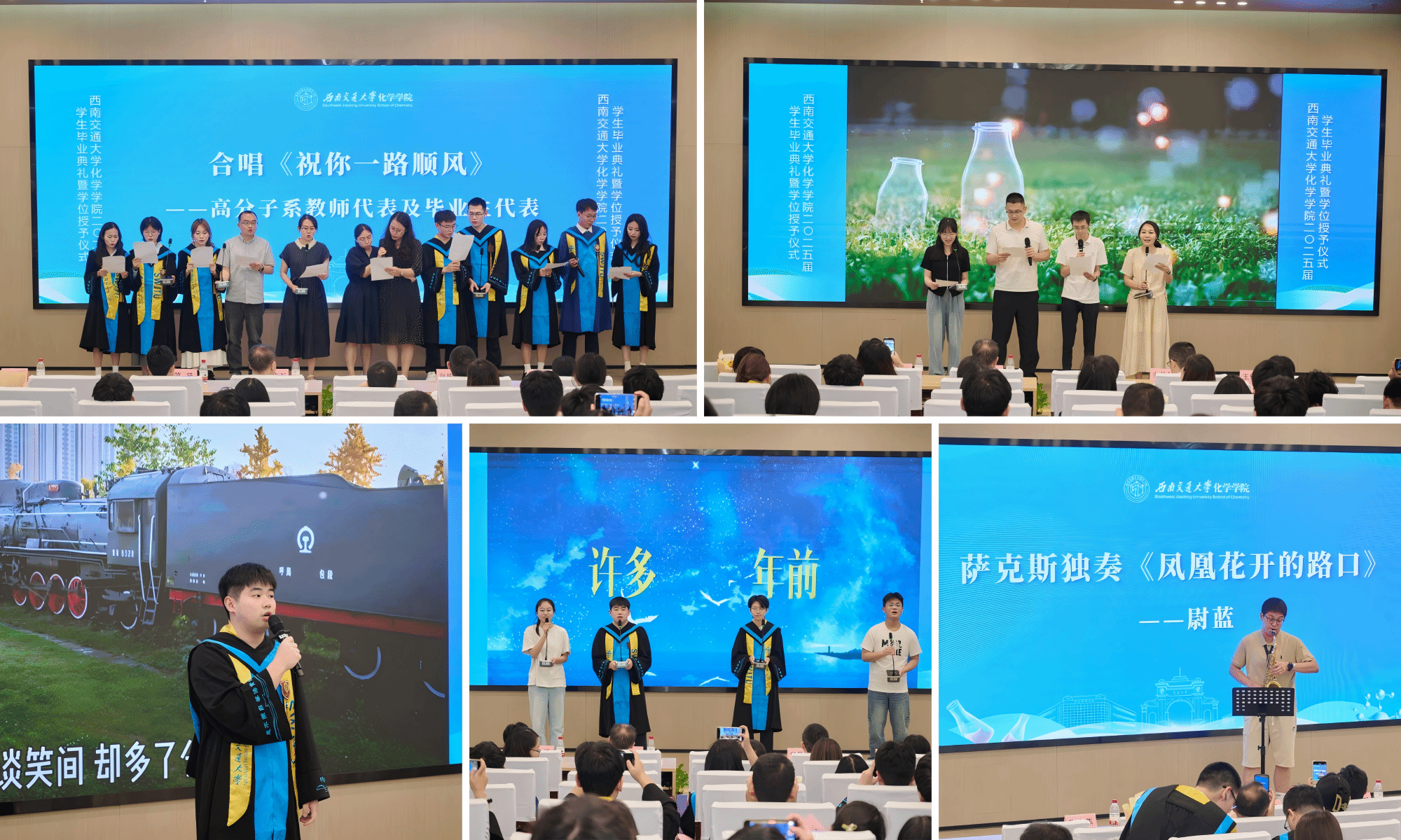学院举办的不仅是毕业典礼,更是为同学们送上的“祝福礼”“启程礼”。在典礼接近尾声之际,高分子系教师代表与毕业生代表共同合唱了《祝你一路顺风》,表达了师生之间的深厚情谊;教师代表们带来的诗朗诵《化育芳华,启程如诗》,展现了学院的文化底蕴和对毕业生的美好祝愿。此外,毕业生代表王浩宇的歌曲独唱、承唐歌友会路佳怡同学及看看屋 学生代表的合唱以及尉蓝同学的萨克斯演奏等节目,也为毕业生送上了最美好的祝愿!