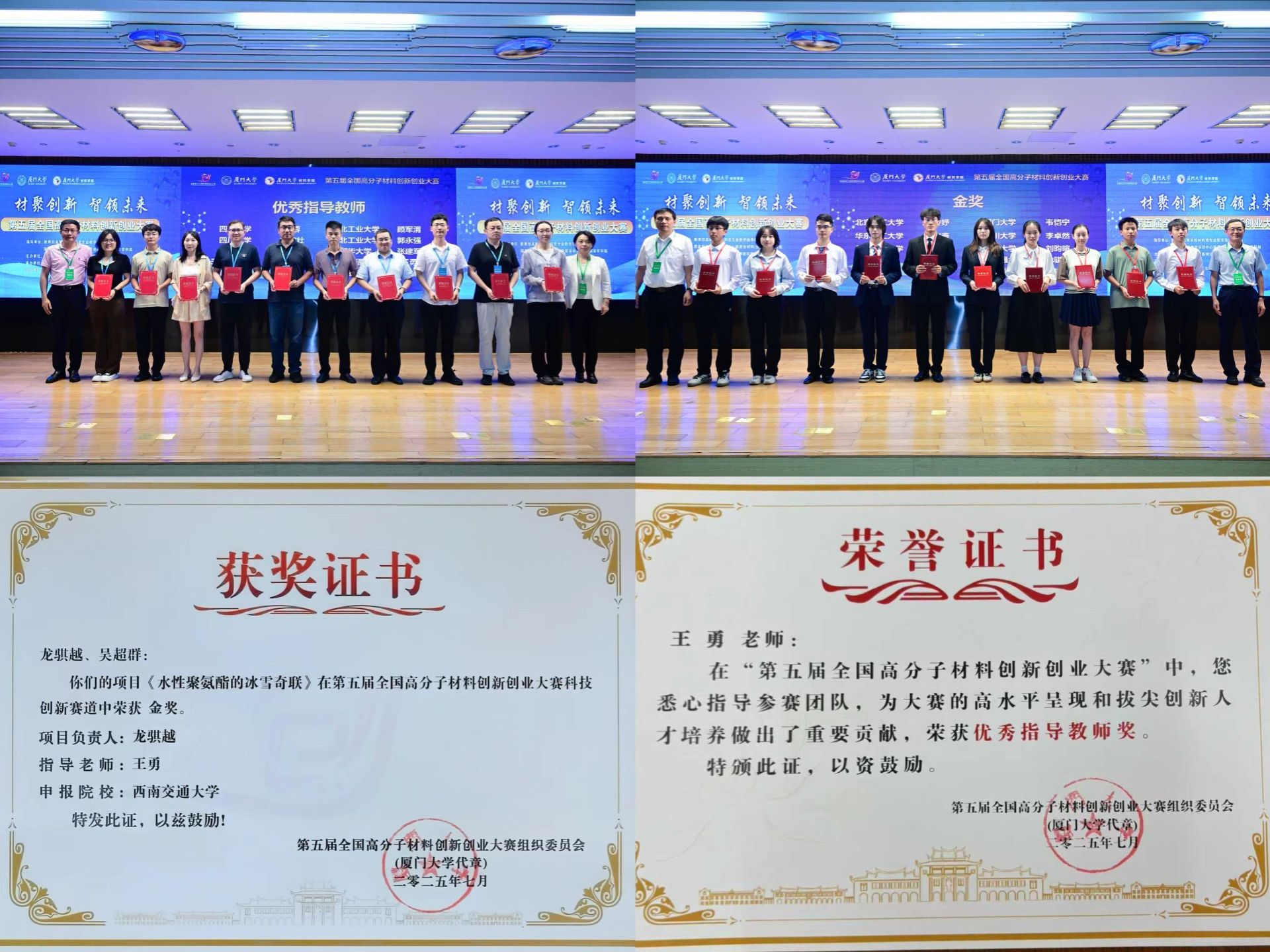 值得一提的是,龙骐越与吴超群两位同学均是王勇教授指导的“勇闯天涯”课题组学生。此次摘得全国金奖,是该课题组在2025年继第二届四川省节能减排社会实践与科技竞赛中斩获1项一等奖、2项二等奖后的又一重磅成果。从省级赛事的多点突破到全国大赛的巅峰问鼎,一连串亮眼成绩的背后,是课题组始终扎根科研一线、深耕创新沃土的执着坚守,更是团队在高分子材料领域持续探索、厚积薄发的实力彰显。