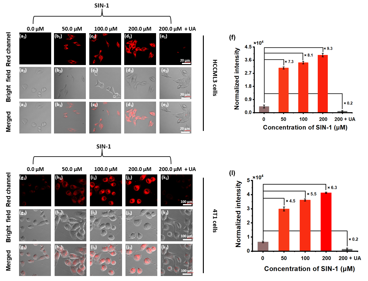 图4. SWJT-43对HCCLM3细胞及4T1细胞中内外源性ONOO⁻动态监测