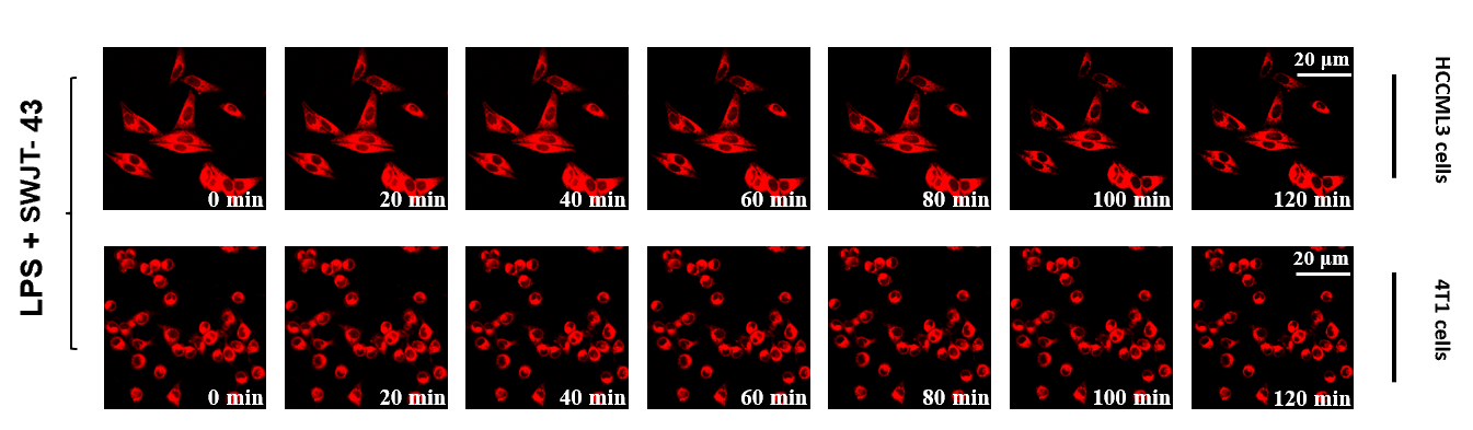 图3. SWJT-43在HCCLM3细胞及4T1细胞中的长期原位成像