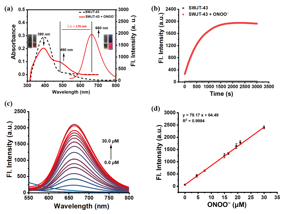 王雅雯教授团队成功开发了一种双氰基异佛尔酮和2-(2′-羟基苯基)-4(3H)-喹唑啉酮(HPQ)的杂化骨架构建了一种可激活的近红外固态荧光探针(SWJT-43),具有高光稳定性和低背景干扰的特性。其通过特异性响应肿瘤微环境中过表达的过氧亚硝酸盐(ONOO⁻),实现对癌细胞的高灵敏度、高选择性检测,检测限低至1.10 nM。在实验中,SWJT-43成功应用于肝癌和乳腺癌细胞的长期原位成像,并能通过实时荧光差异快速区分癌变组织与正常组织。在动物模型中,该探针实现了对小鼠原位肝癌及乳腺癌肿瘤的特异性标记,为精准手术切除提供可靠的荧光导航,显著提升了手术的准确性。