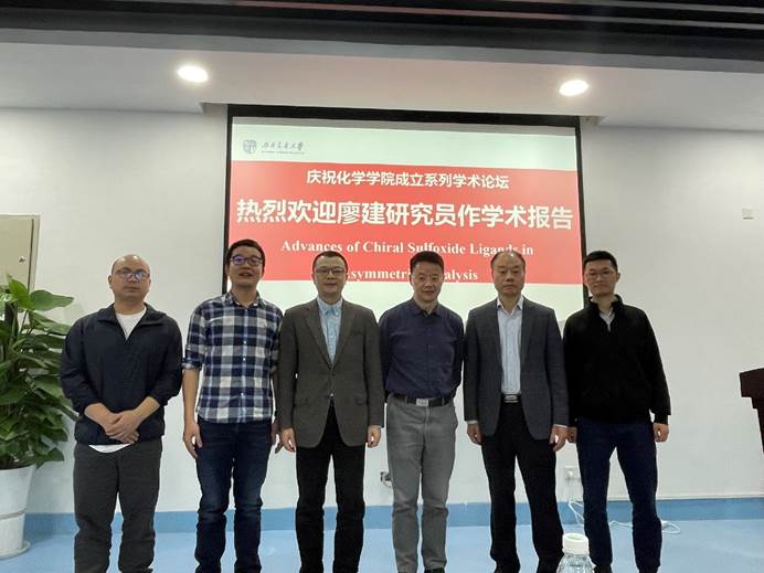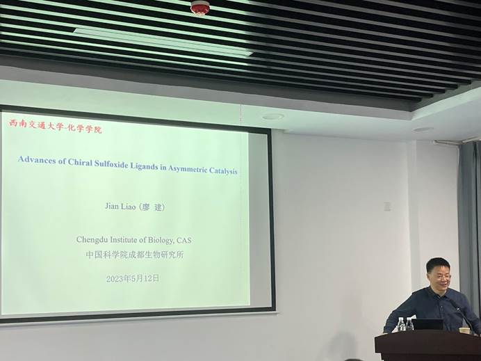 5月12日上午,中国科学院成都生物所廖建研究员应彭羽教授邀请来校交流,并以“Advances of Chiral Sulfoxide Ligands in Asymmetric Catalysis”为题做了一场精彩的学术报告。此次报告会在九里校区工业中心C座203会议室举行,由看看屋