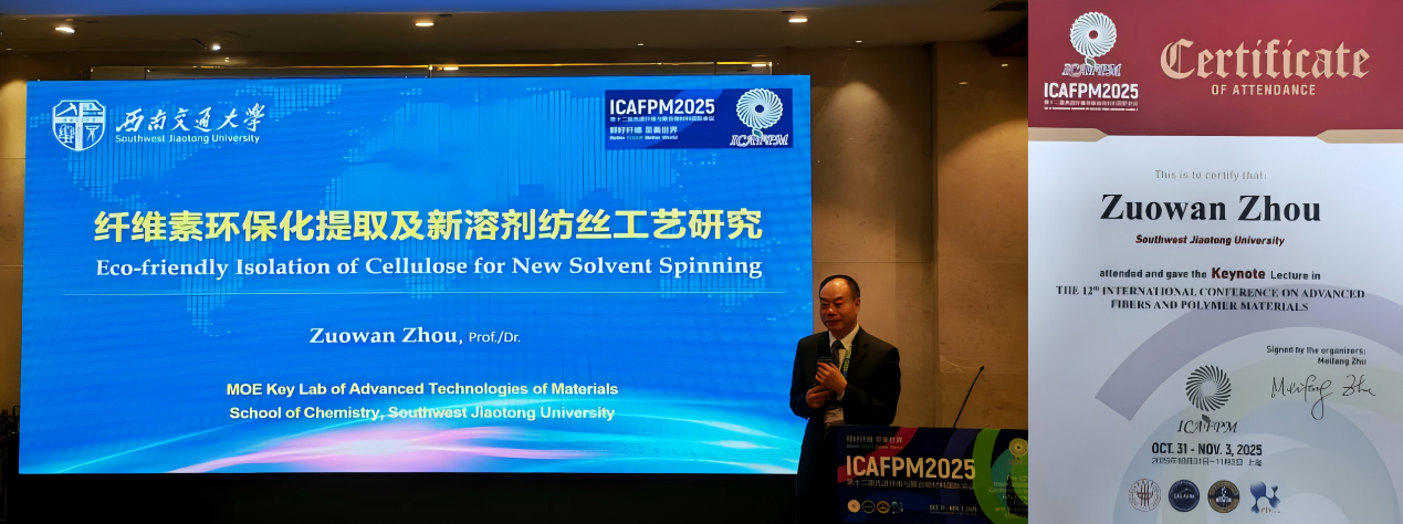 周祚万教授应邀在“绿色可持续发展论坛”上作题为“纤维素环保化提取及新溶剂纺丝工艺研究”的主题报告(Keynote Speech),系统报告了团队在天然纤维素绿色提取技术、新型溶剂纺丝工艺和相关领域方面的研究进展,受到与会专家的广泛关注和热烈讨论。会后,多位专家学者以及中国纺织工业联合会、中国化学学会高级专员与周教授进行了深入交流,探讨了相关技术的前景与推广应用途径。我校功能高分子材料团队的博士生李兴珍和张贺也一同参加了会议,并积极参与了学术交流与研讨;周祚万教授还应邀出席相关学术交流活动,并主持论坛报告会。