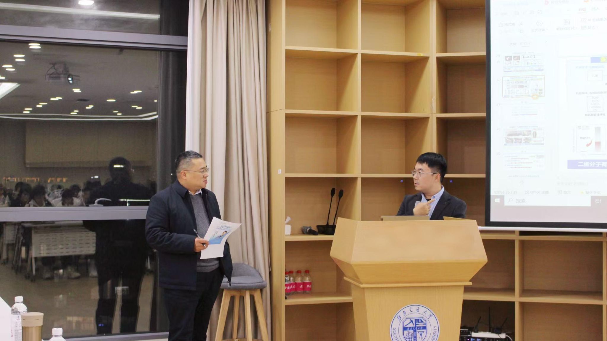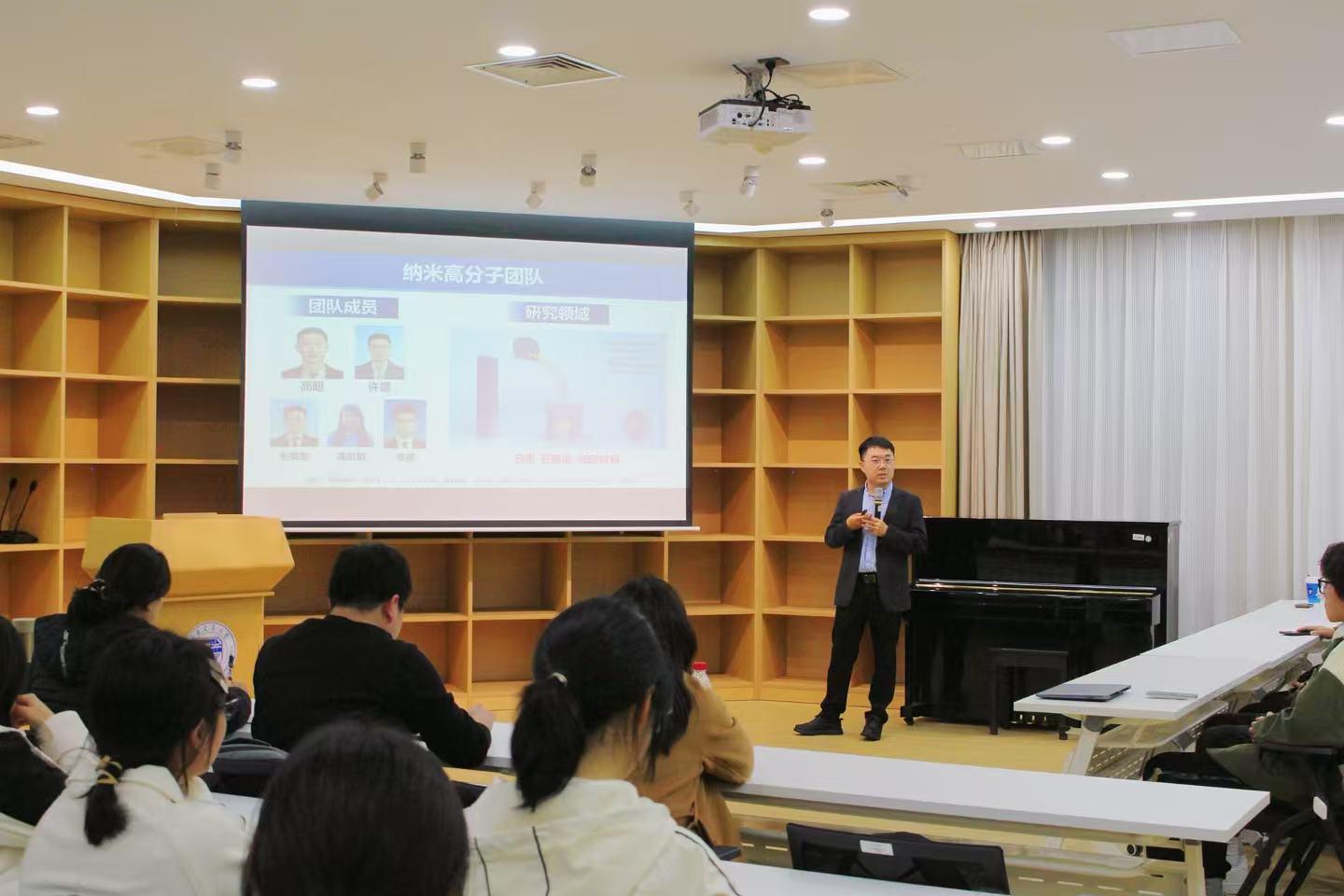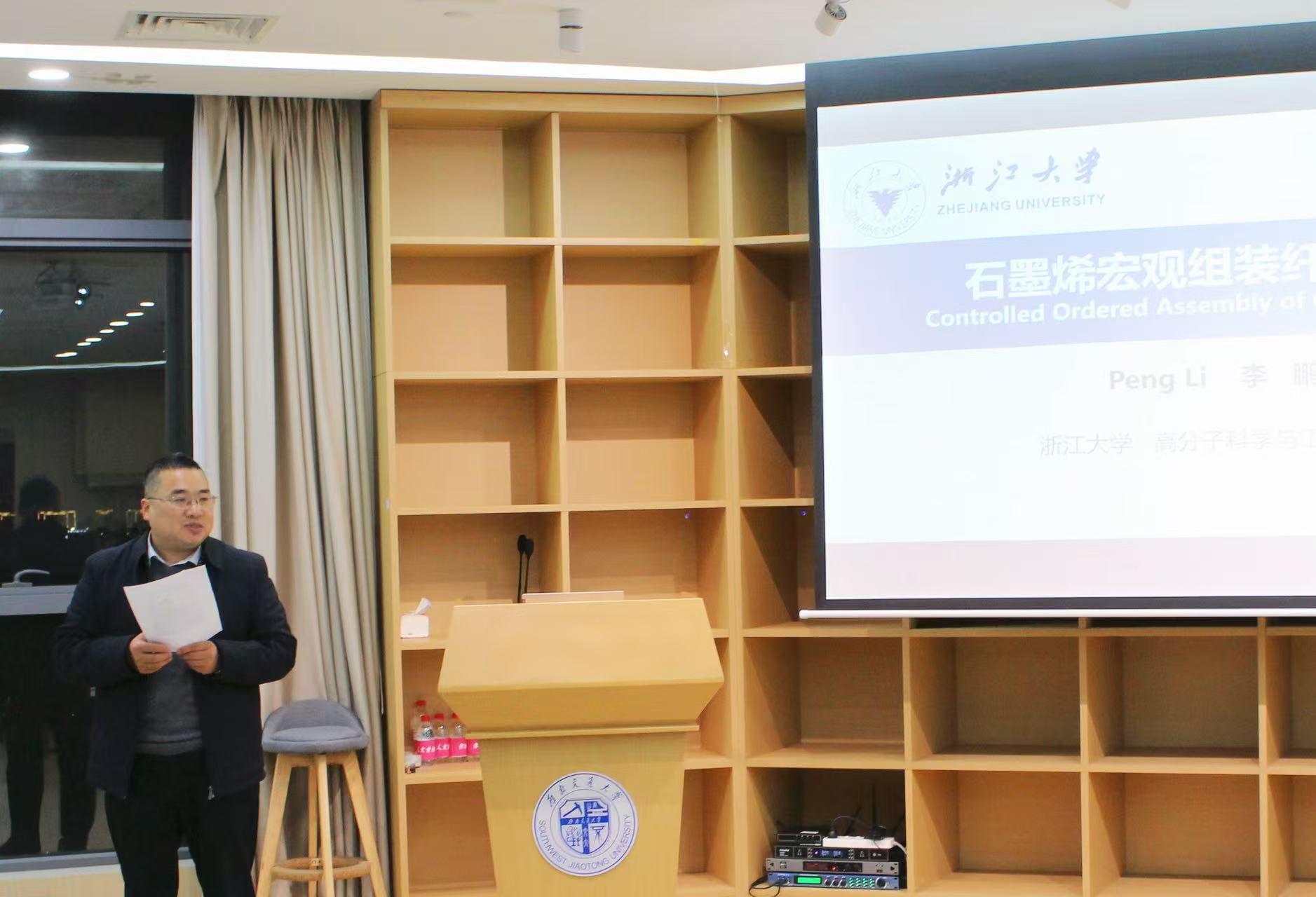 毕业的优秀学长李鹏老师,面向“大材料”方向学生开展石墨烯宏观组装纤维材料交流分享会,为化院学子搭建了与前沿科研对话、向优秀学长学习的宝贵平台。讲座由学院副院长王勇老师主持。