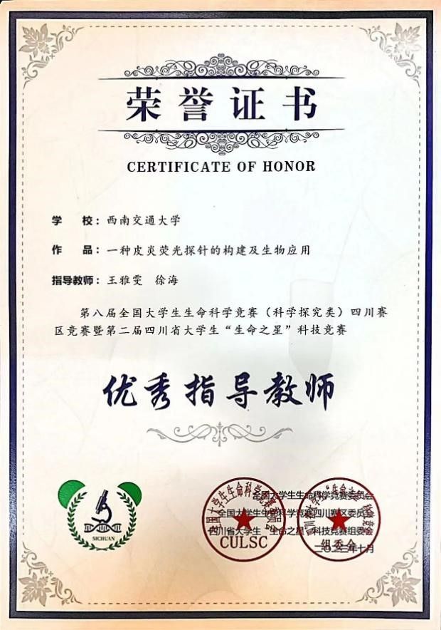王雅雯老师指导的项目《一种皮炎荧光探针的构建及生物应用》荣获全国二等奖。