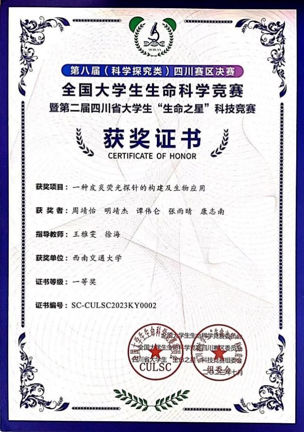 该项目依托大学生创新创业训练计划,在学校相关部门的关心支持及指导老师的指导下,团队成员们圆满完成了项目中的所有实验。在今年7月四川农业大学举办的第二届四川省大学生“生命之星”科技竞赛中获得“一等奖”并推荐参加国家级比赛。