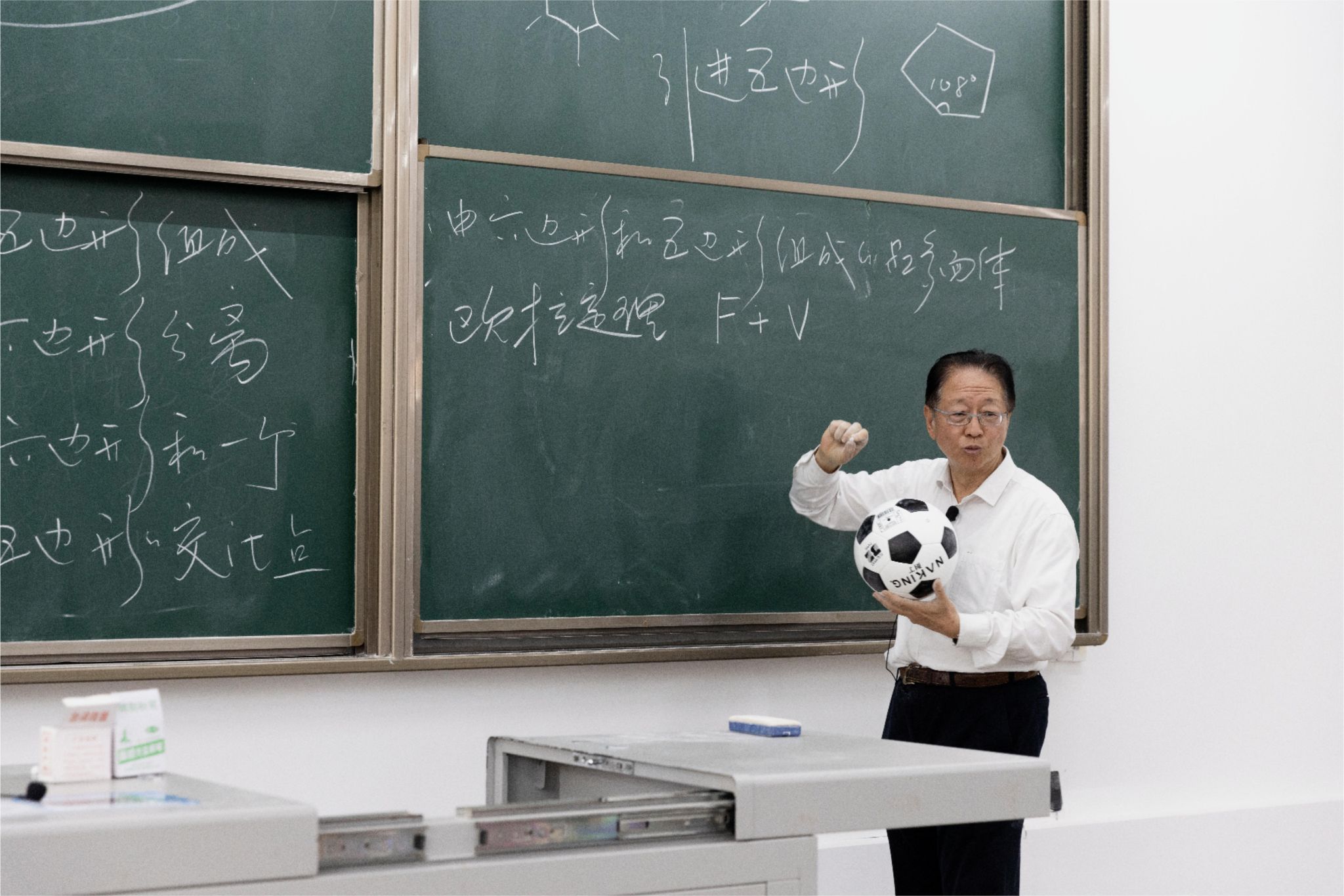 郑兰荪院士通过一个足球生动讲述了“富勒烯”,即足球烯的微观结构和原子团簇,将抽象的物质性质形象化,将化学理论与数学工具相结合,把原子团簇的结构生动地展现在同学们面前。