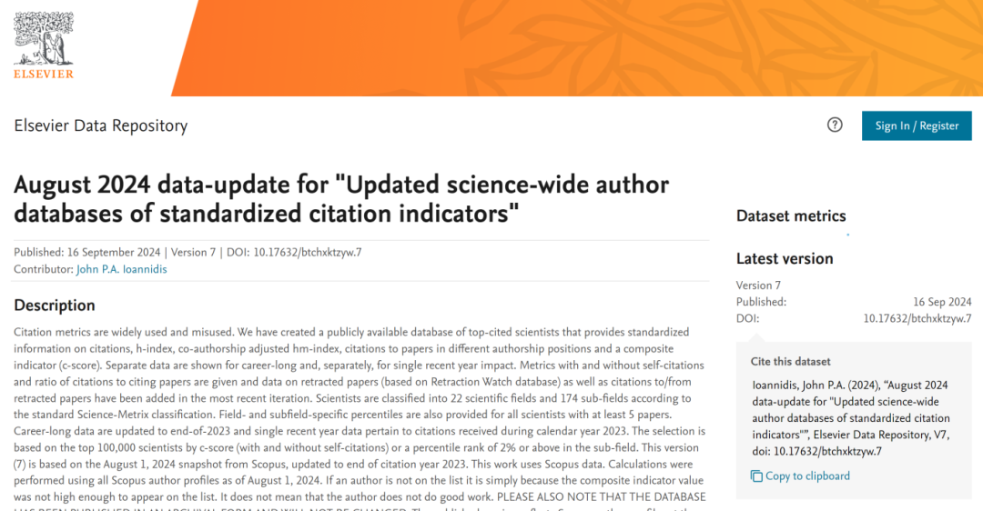 榜单链接:https://elsevier.digitalcommonsdata.com/datasets/btchxktzyw/7