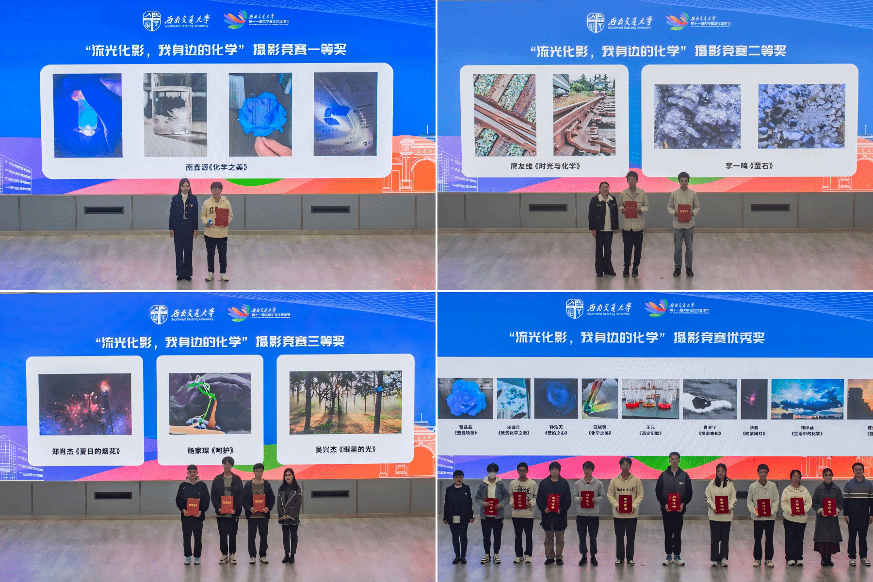 在文化节筹备前期,为鼓励全校同学寻找并感受生活中、学习中的化学之美,特别开展了“流光化影,我身边的化学”摄影作品竞赛活动,全校有近100名同学参与,他们走进实验室亦或是走在校园,用镜头捕捉了有关化学的美丽瞬间。经学校师生代表评审,共评选出一等奖1名、二等奖2名、三等奖3名和优秀奖10名。文化节开幕式现场举行了颁奖仪式。