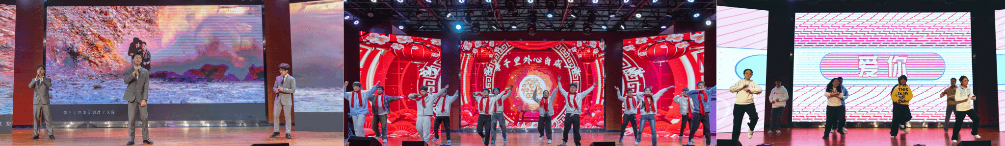 晚会的第三篇章“化梦新天”上,看看屋 学生会的同学们带来舞蹈《相亲相爱》,手臂挥舞、告别昨日的遗憾,手臂挥舞、迎接明天的希望;高分子2023-02班曹基磊、杜子聪、任俊杰带来歌曲《我是如此相信》,悠扬的旋律中满怀对未来的美好憧憬;本科2024级新生辅导员及朋辈导师带来舞蹈《爱你》,传递对新生的热烈欢迎与真挚关怀。
