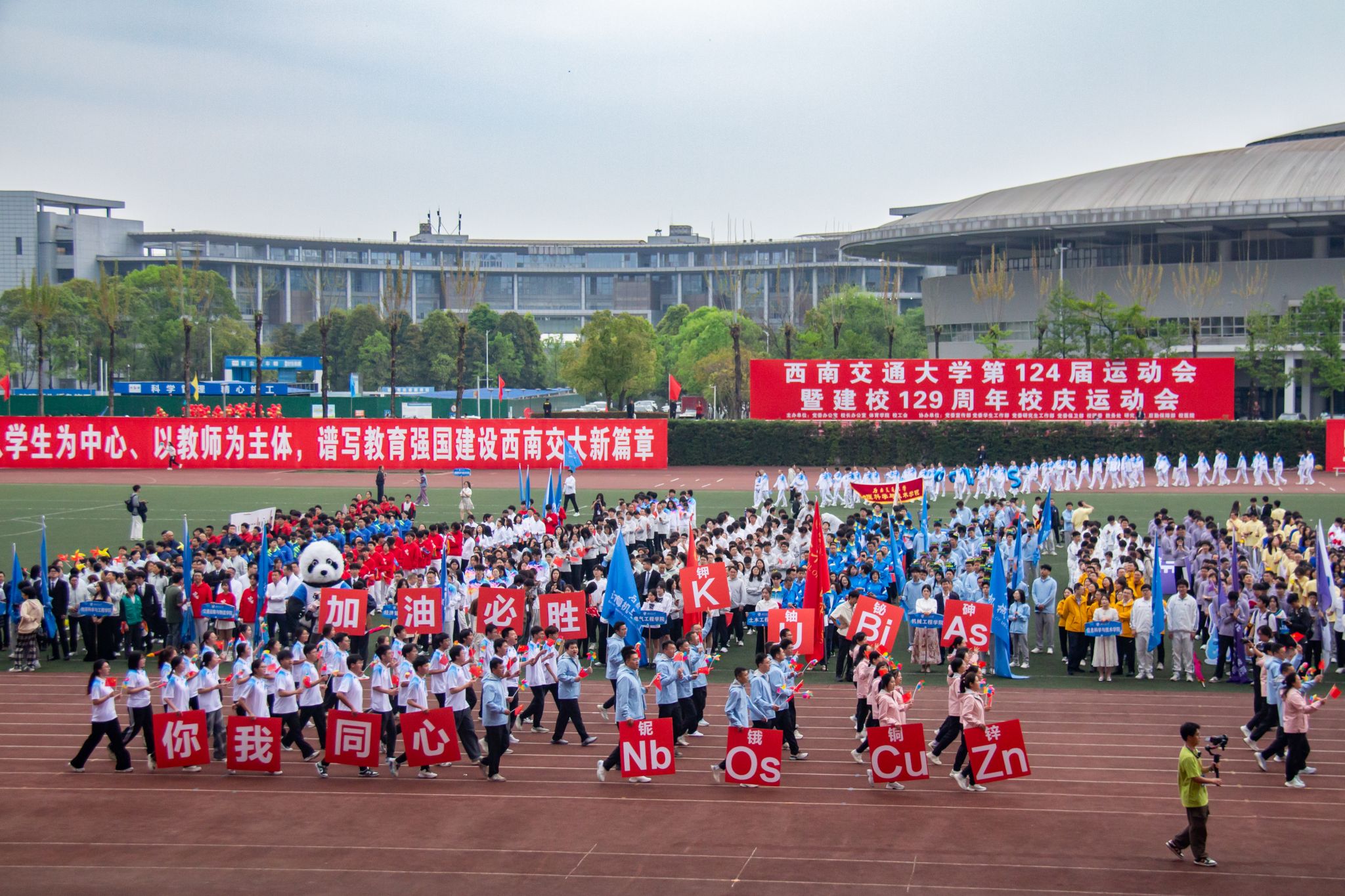 开幕式上,由学院党委书记向仲敏,院长、党委副书记周祚万带队的师生方阵,以矫健的步伐踏入会场,“铌锇铜锌,你我同心!”“钾铀铋砷,加油必胜!”创意元素标语方阵如化学键般紧密联结,在行进间迸发出科学与青春碰撞的璀璨火花,极具学科特色的口号声浪,化作赛场上首个锋芒毕露的“化学反应”。