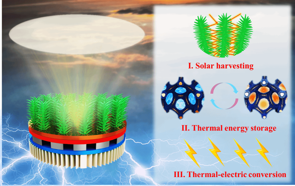 本文通过高效的自组装策略在铜泡沫表面构建有序的Cu-MOF(金属有机框架)阵列,形成独特的松针状结构(Cu-OH-H)来封装聚乙二醇(PEG)。Cu-OH-H支架由3D连续微米级铜骨架和纳米级Cu-MOF阵列组成,形成微-纳双尺度封装体系。这种多尺度结构通过强大的毛细管力和氢键作用为PEG 提供了理想的封装环境,即使在熔点以上也能确保出色的结构稳定性。同时,铜泡沫与分层结构的协同作用促进了热量的分布和快速传递,将Cu-OH-H/P的导热系数提高到2.35 W/mK,增幅达734%。值得注意的是,松针状结构通过增强多重光散射和捕获,实现了高效光吸收和最小反射,光热转换效率高达96.9%。基于Cu-OH-H/P的太阳能驱动热电转换系统表现出对不同气候的出色适应性,最大输出电流达129.3 mA,能够实现稳定的全天候供电,为解决可再生能源间歇性问题提供了新的途径,在未来清洁能源领域展现广阔的应用前景。