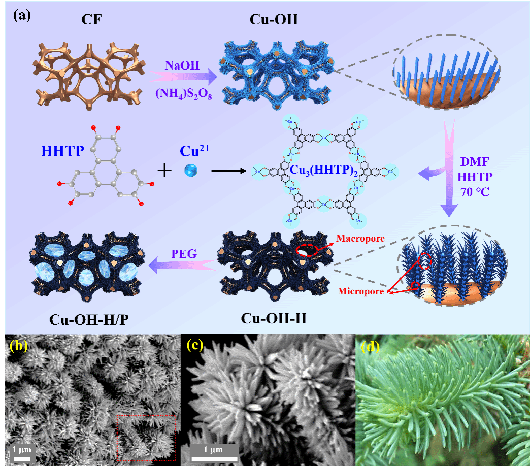 图2. (a) Cu-OH-H/P的制备流程。(b-c) Cu-OH-H的微观形貌和 (d) 松针数码照片。