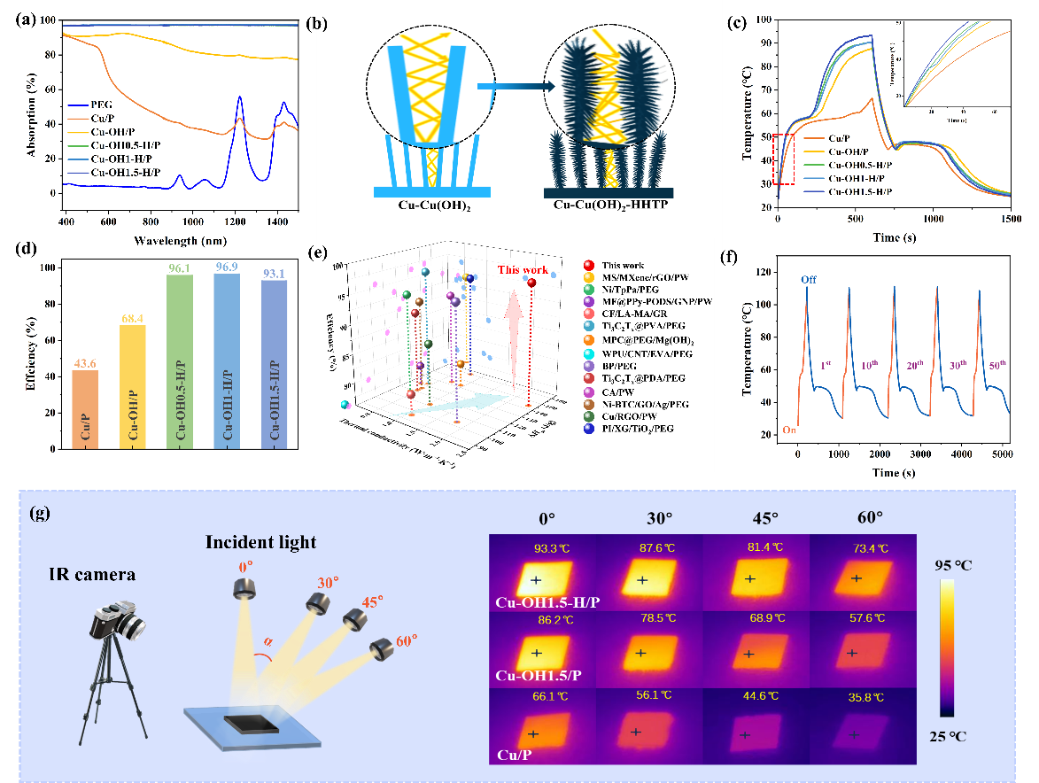 图5. (a) PEG, Cu/P和Cu-OH-H/P的UV-Vis-NIR光谱图。(b) Cu-OH-H 结构的光捕获示意图。(c) Cu/P和Cu-OH-H/P在光照和无光条件下的温度变化曲线。(d) 相变复合材料的光热转换效率。(e) 本工作与其他工作的性能对比图。(f) Cu-OH-H/P在在重复光热循环后的性能稳定性。(g) Cu/P和Cu-OH-H/P在不同入射角下表面稳态温度的变化。