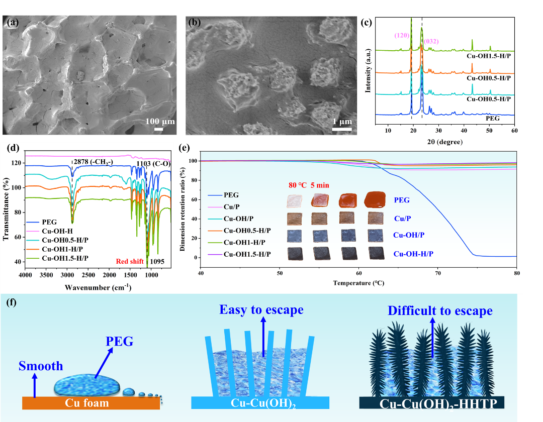 图3. (a, b) Cu-OH-H/P的SEM图。(c) PEG和Cu-OH-H/P的谱图。(d) Cu-OH-H/P的红外光谱。(e) PEG, Cu/P和Cu-OH-H/P的形状稳定性测试。(f) Cu-OH-H双尺度结构的封装机理图。