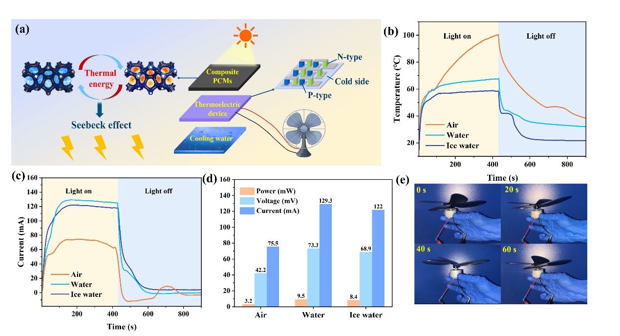 图6. (a) 光-热-电转换系统的工作示意图。光-热-电转换系统在光照和不同散热环境下的 (b) 温度变化和 (c) 输出电流。(d) 系统在空气、水和冰水中的最大输出电压、电流和功率。 (e) 关闭光源后风扇的运行时间。