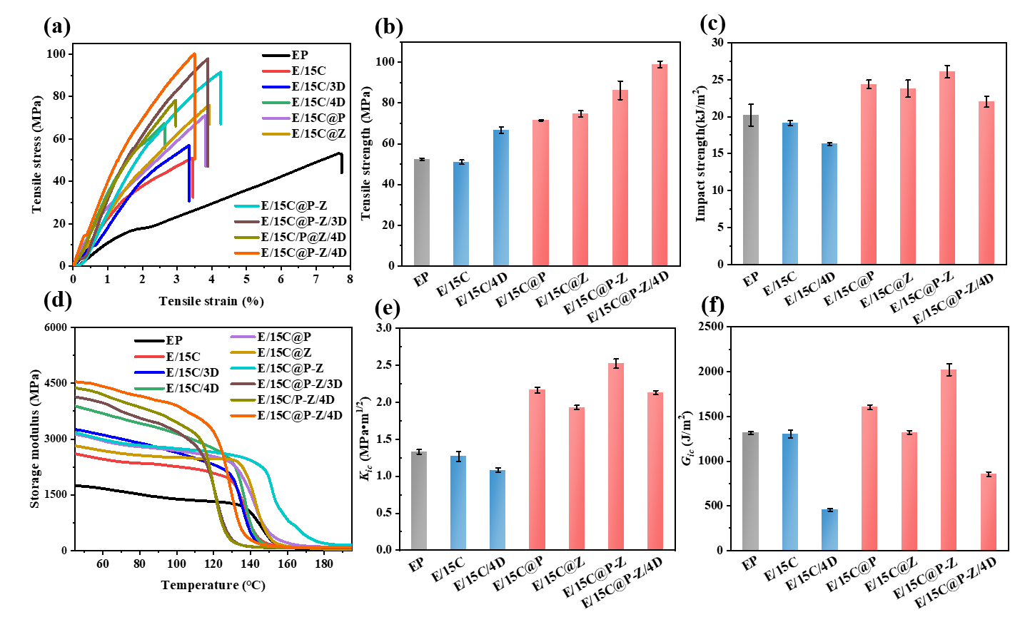 碳纤维 (CF) 增强环氧树脂 (EP) 复合材料 (E/C) 已广泛应用于众多领域,但由于 CF 的“烛芯”效应,它们始终受到低阻燃性的困扰。尽管添加阻燃剂的传统方法使复合材料能够获得一定的阻燃能力,但它会损害复合材料的机械性能。因此,亟需开发一种兼具优异阻燃性能和机械性能的复合材料。