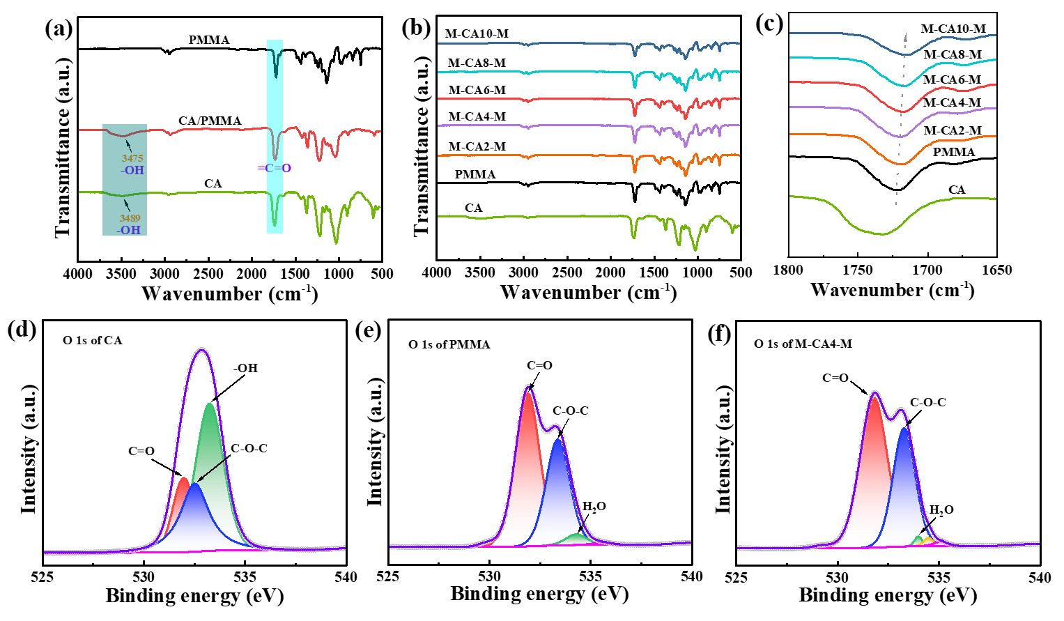 图1. (a) CA, PMMA和CA/PMMA共混物的红外光谱。(b, c) 不同复合薄膜的红外光谱。 (d-f) CA,PMMA和M-CA4-M复合薄膜的O1s高分辨率XPS光谱。