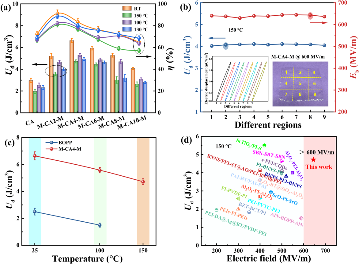 图5. (a) 不同复合薄膜不同温度下最大击穿电场储能性能比较。 (b) 600 MV/m场强下M-CA4-M复合薄膜不同区域储能性能汇总。 (c) 不同温度下M-CA4-M复合薄膜与BOPP储能密度对比。(d) M-CA4-M复合薄膜与文献中报道的其他薄膜储能密度对比。