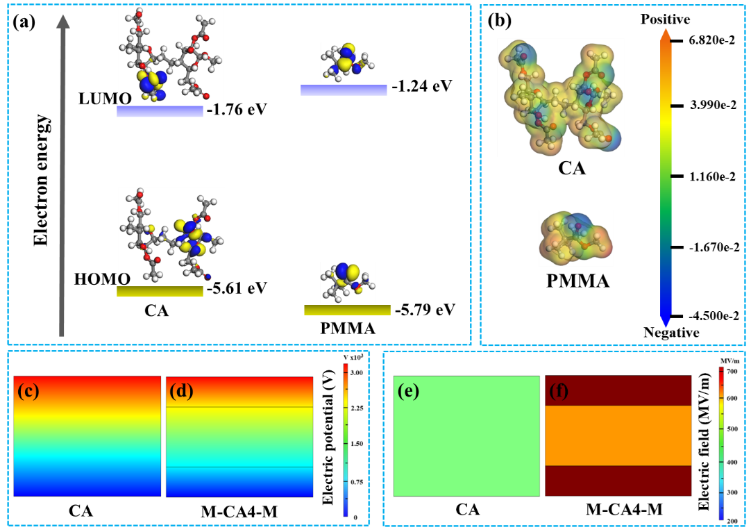 图3. (a) CA,PMMA各自HOMO和LUMO能级图。(b) CA,PMMA静电势分布图。CA单层薄膜和M-CA4-M复合薄膜的(c, d) 电势和(e, f) 电场分布有限元模拟图。