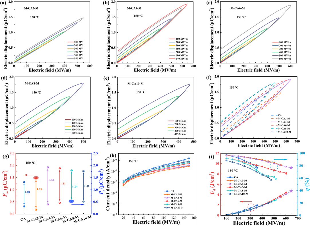 图4. (a-e) 不同复合薄膜150℃的D-E loops。(f) 不同复合薄膜150℃最大场强下D-E loops的比较。(g) 不同复合薄膜150℃最大场强下净极化汇总。(h) 不同复合薄膜150℃漏电流图。 (e) 不同复合薄膜150℃储能性能。