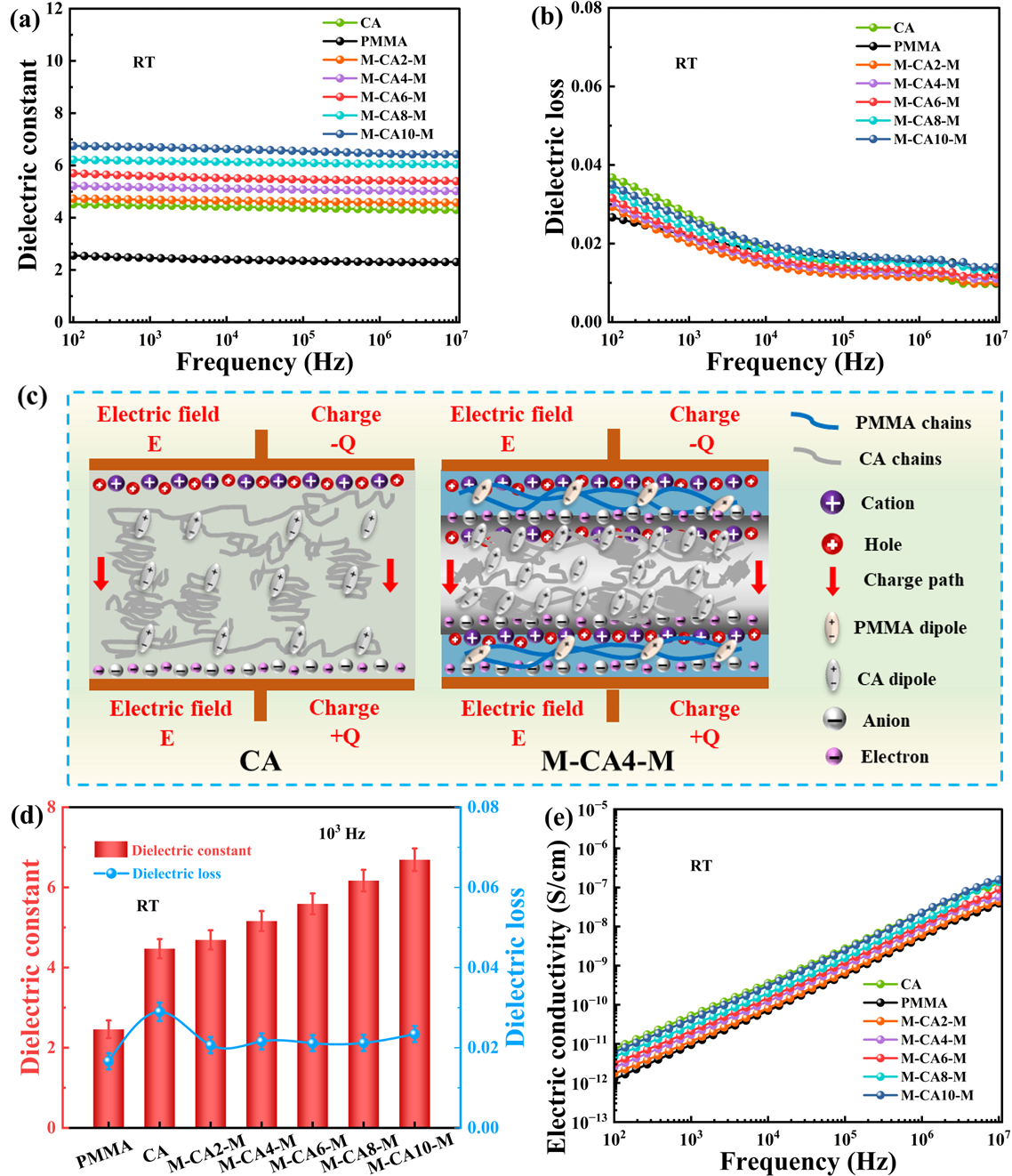 图2. (a) 不同复合薄膜介电常数频谱图。 (b) 不同复合薄膜介电损耗频谱图。(c) 介电性能机制示意图。(d) 不同复合薄膜103 Hz时介电性能对比图。(e) 不同复合薄膜电导率频谱图。