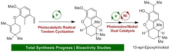 松香烷型二萜天然产物由于结构的复杂性和生物活性的多样性,引起了众多有机合成化学家和药物化学家的研究关注。我们课题组发展光催化的串联环化反应,快速构建目标分子的四环并合骨架。接着,再次利用光催化和镍催化相结合的还原偶联反应引入异丙基片段,从而完成松香烷二萜10-epi-Epoxyhinokiol的合成。该策略具有简洁、高效等绿色化学特色,有望发展成为一种普适性的多环体系构建方法。