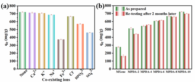 本工作提出了聚多巴胺(PDA)诱导的MXene仿生改性的新方法。为了探究PDA对MXene的微观结构和吸附性能的影响,PDA首先在MXene溶液中进行了原位聚合,制得MXene/PDA复合材料。本工作通过不同的吸附测量,深入研究了MXene/PDA复合材料对有害重金属离子Cr(VI)的去除能力。有趣的是,PDA纳米颗粒促进了MXene的剥离,从而导致比表面积增加和吸附位点暴露。此外,MXene和PDA在去除Cr(VI)方面有很强的协同作用,成功实现了对Cr(VI)的极高吸附能力(862.3mg/g);同时,吸附在复合粒子上的Cr(VI)约有54.3%还原为Cr(III)。在水基条件下存放两个月后,MXene的稳定性得到了极大的改善,复合材料仍然表现出较高的吸附能力,其吸附能力仅降低了3.3%。本工作表明MXene/PDA复合材料可以作为一种替代性的吸附剂,用于去除废水系统中的有害Cr(VI)。