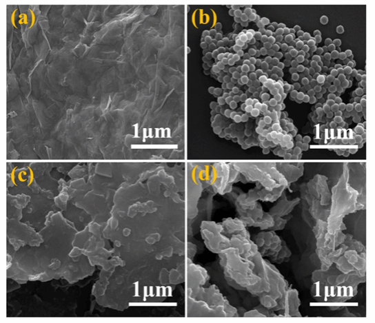 图2 样品的SEM图:(a) MXene纳米片;(b) PDA纳米颗粒;(c) MPDA-2;(d) MPDA-10