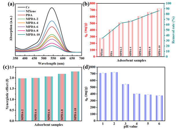 图3 (a) 不同样品对Cr(VI)溶液的吸附能力对比;(b) 不同样品对Cr(Ⅵ)溶液的去除率和吸附容量的比较;(c) 协同效应随吸附剂样品成分的变化;(d) MPDA-10复合颗粒对不同pH值的Cr(VI)溶液的吸附能力变化