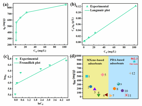 图4 (a) 不同初始浓度的Cr(Ⅵ)溶液(50-250 mg/L)对MPDA-10复合颗粒的吸附能力的影响,测试在pH值为2,温度为25 ℃,吸附时间为24 h,搅拌速度为180 rpm的条件下进行;(b) MPDA-10复合颗粒的Langmuir和(c) Freundlich等温线吸附模型;(d) MPDA-10复合颗粒与其他MXene基和PDA基材料对Cr(VI)的最大吸附能力的比较
