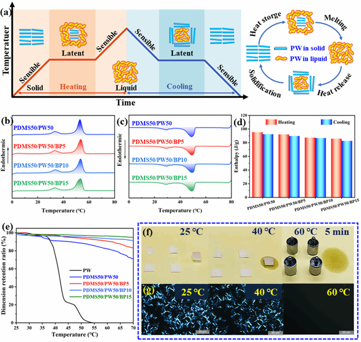 图3. (a) PW 在相变过程中的工作原理图。(b,c) PDMS50/PW50/BP的DSC曲线和 (d) 热焓值。(e) PW,PDMS50/PW50和PDMS50/PW50/BP的形状维持率和 (f,g) 在实际加热时的数码照片和POM图。