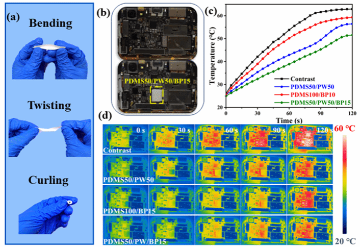 图4. (a) PDMS50/PW50/BP15的柔性测试图。(b) 智能手机的数码照片。(c) PDMS50/PW50、PDMS100/BP15和PDMS50/PW50/BP15用于手机热管理的温度-时间曲线和 (d) 红外热成像图片。