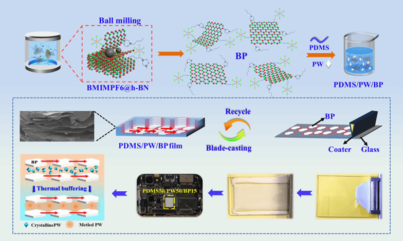 本文以石蜡(PW)作为热能存储单元,聚二甲基硅氧烷(PDMS)封装PW并赋予复合材料柔性,1-丁基-3-甲基咪唑六氟磷酸盐修饰的六方氮化硼纳米片(BPs)提高复合材料的热导率。首先通过湿法球磨工艺制备了高质量的BPs,其次利用刮涂过程中的强剪切力使BPs在PDMS/PW基体中沿刮涂方向定向排列,并形成完善的互连导热网络。这种独特的平行结构使得复合材料在15 wt% BPs含量下,面内热导率达到2.87 W·m-1·K-1,较PDMS/PW提高了1494%。特别是,PW利用其相变特性能够在热量激增时迅速吸收多余热量,在温度下降时又缓慢释放热量,有效平衡温度波动。在智能手机应用测试中,相变吸热和氮化硼定向散热的协同作用使手机工作温度降低11 °C,展现出优异的热管理效果。有限元分析进一步证实了BPs网络的平行排列能够提供快速传热通道,而PW的相变热能缓冲则有效抑制温度峰值,两者协同作用显著提升了复合材料的整体热管理性能。此外,PDMS/PW/BP复合材料还具有优异的阻燃和电绝缘性能,这对电子设备的安全性提供了额外保障。本研究在电子设备热管理领域展现出巨大的应用潜力,有望为下一代高性能电子产品的热管理问题提供有效的解决方案。
