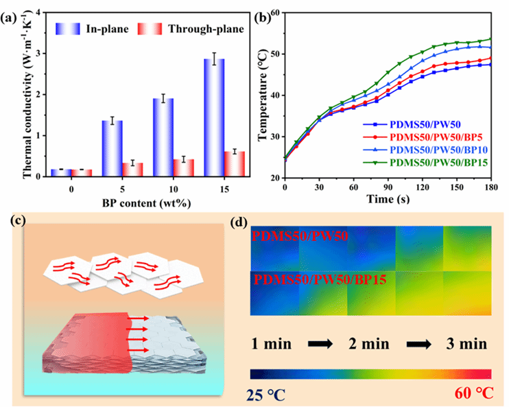 图2. (a) PDMS/PW/BP的面内导热率和面外导热率。(b) PDMS50/PW50和PDMS50/PW50/BP 的温度变化曲线。(c) 热传导机理图。(d) PDMS50/PW50和PDMS50/PW50/BP15在实际加热时的红外热成像图。