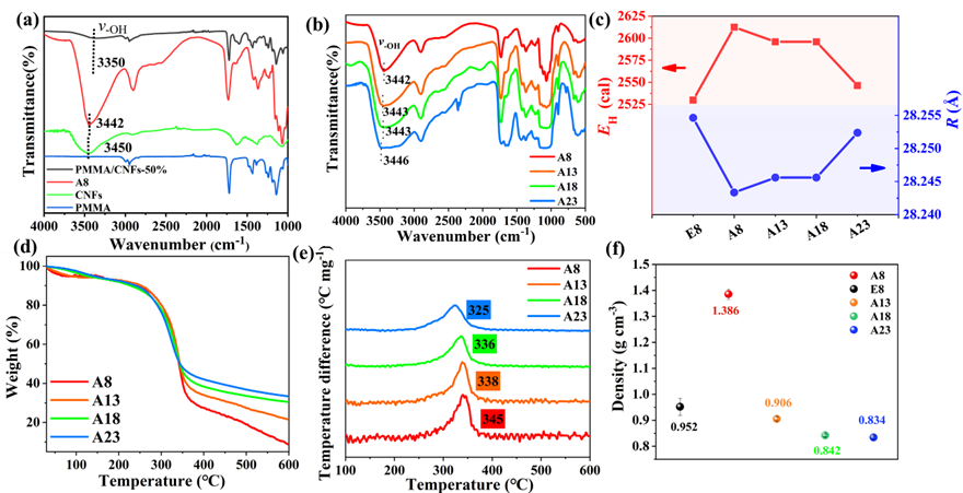 图3. (a)PMMA、CNFs、A8和PMMA/CNF复合材料以及(b)不同厚度Ax薄膜的傅立叶变换红外光谱;(c)E8和Ax薄膜之间氢键能量(EH)和键距(R)的比较;(d)Ax薄膜的TGA和(e)DTG曲线;(f)所示薄膜密度的比较。