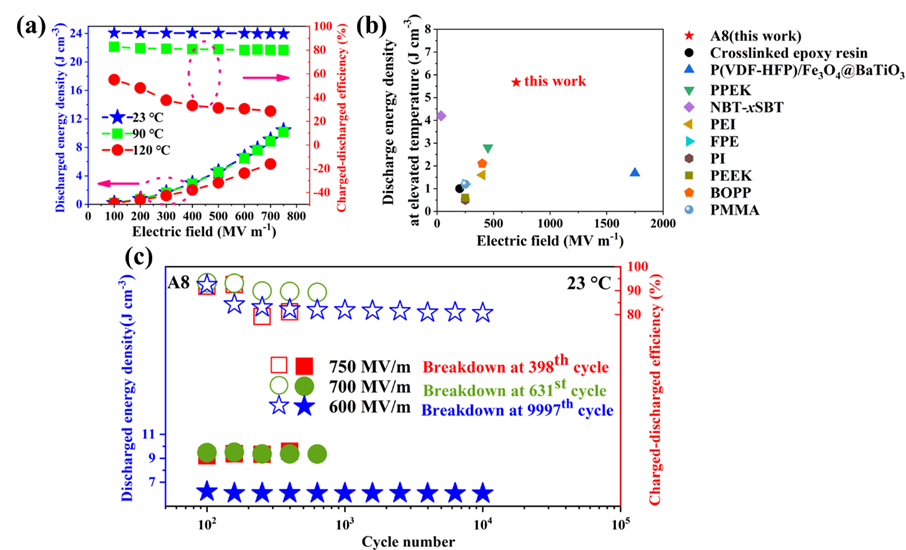 图5. A8薄膜在加热和电疲劳试验中的储能性能:(a)在23、90和120℃下测得的Ue和η值的变化;(b)在 120℃下测得的A8薄膜的储能性能与文献中报道的在70-150℃温度范围内测得的其他选定电介质的储能性能的比较;(c)如图所示,在23℃下测得的A8薄膜在不同电场中的循环性能。