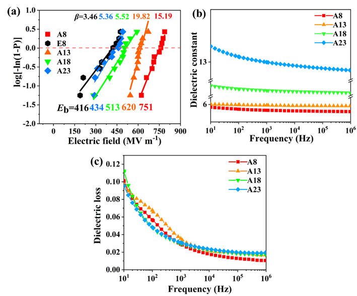 图6. 所示薄膜的介电性能:(a)所示不同薄膜在室温下击穿强度的 Weibull 分布;(b)所示薄膜的介电常数和介电损耗。
