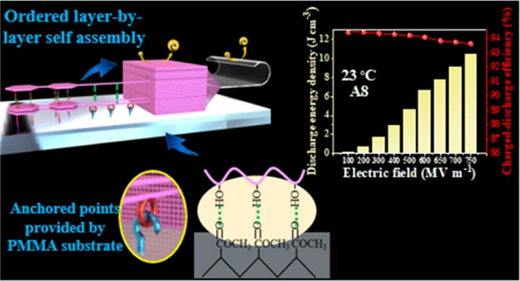 本文通过控制基材与纤维素薄膜之间的界面相互作用,调控纤维素分子链的取向排列程度,从而制备分子链高度取向的再生纤维素薄膜,显著降低薄膜的内部缺陷,提高其储能性能。研究发现,由于聚甲基丙烯酸甲脂(PMMA)的C=O和纤维素的O-H之间具有很强的相互作用,PMMA基底为纤维素分子链提供了锚点,激发纤维素分子链的定向有序排列,有效减少纤维素薄膜中的缺陷和气孔。结果表明,纤维素内部的超高密度抑制了因极化引起的电致伸缩,抑制了电子注入和电子输运,有利于提高纤维素的机械击穿强度和电击穿强度。通过该方法制备的再生纤维素薄膜(A8)具有751 MV m-1的超高击穿强度和10.39 J cm-3的放电能量密度,并且充放电效率高达93.6%。本研究不仅为制备高性能聚合物基电介质材料开辟了新的道路,也证实了纤维素在电介质储能和应用方面的巨大潜力。