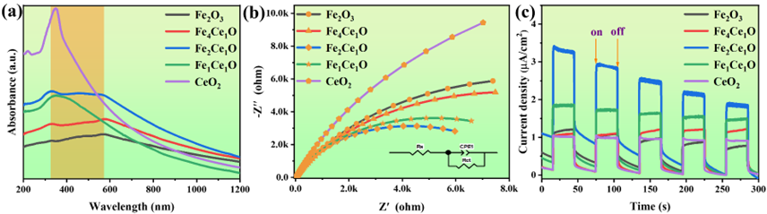 图3. Fe2O3、Fe4Ce1O、Fe2Ce1O、Fe1Ce1O 和 CeO2的紫外吸收光谱(a)、电化学阻抗谱(b)和瞬态光电流响应谱图(c)。