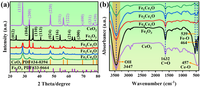 图2. Fe2O3、Fe4Ce1O、Fe2Ce1O、Fe1Ce1O 和 CeO2的X射线衍射谱图(a)和红外光谱图(b)。