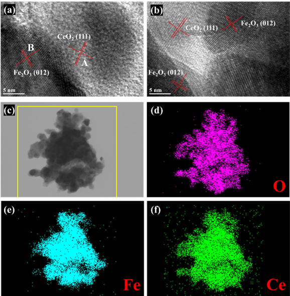 图1. (a, b) Fe2Ce1O的HRTEM图。(c) Fe2Ce1O的TEM图及其对应的O (d), Fe (e), Ce (f)的元素分布图。