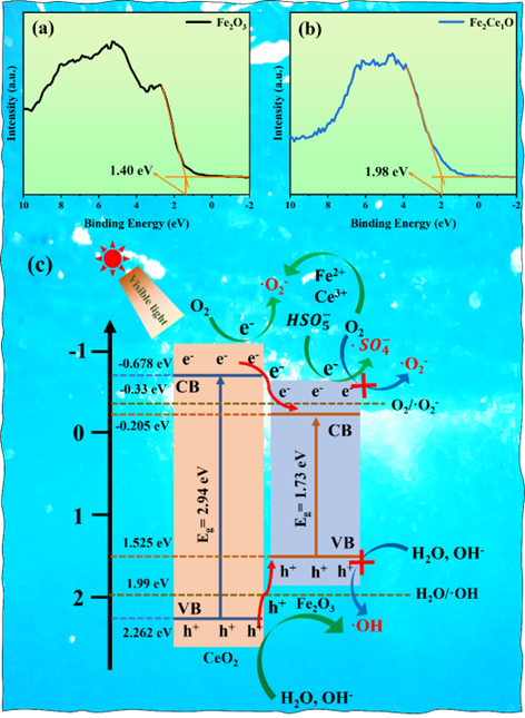 图6. Fe2O3 (a)和Fe2Ce1O (b)的XPS价带图。(c) MO和CR在Fe2Ce1O/PMS/vis体系上可能的光催化机理。