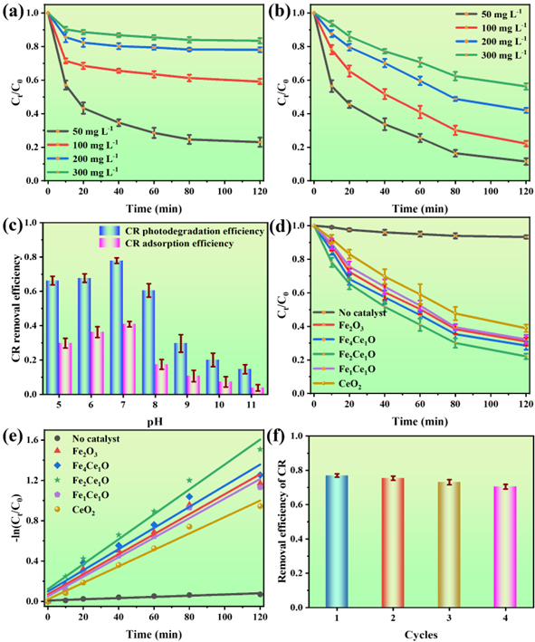 图5. (a) CR初始浓度对Fe2Ce1O吸附活性的影响。(b) CR初始浓度对Fe2Ce1O光降解能力的影响。(c)实验2h后CR光降解和吸附能力的比较。(d)不同催化剂对CR降解活性的影响,以及对应的光催化动力学(e)。(f) Fe2Ce1O连续循环光降解CR。
