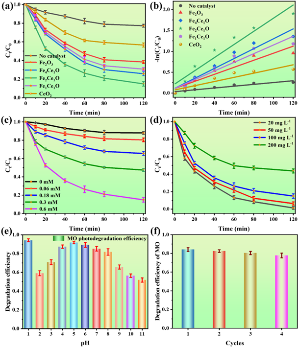 图4. (a)不同催化剂对MO降解的影响,以及相应的光催化动力学(b)。(c)不同浓度的PMS体系下Fe2Ce1O对MO的降解能力。(d) MO初始浓度和(e)初始溶液pH对MO催化活性的影响。(f) Fe2Ce1O连续循环光降解MO。