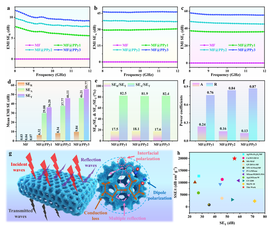 图7 MF@PPy泡沫的电磁干扰屏蔽性能。MF和MF@PPy泡沫的aSEA、bSER 、cSET和 d平均SE值。e MF@PPy泡沫的SER/SET和SEA/SET值。f MF@PPy泡沫的功率系数。g MF@PPy泡沫的电磁干扰屏蔽机理示意图。h MF@PPy泡沫的SSE/t和SET与相关研究的比较。
